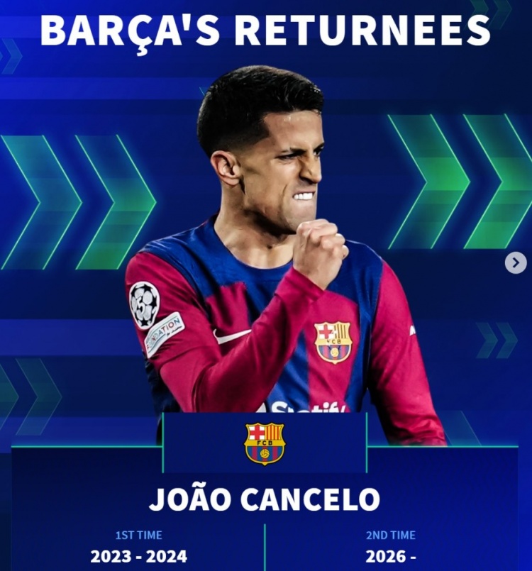 1月14日讯 巴萨已经官宣租借引进利雅得新月边后卫坎塞洛,《转会市场》也列出了多位先后2次效力巴萨的球员。